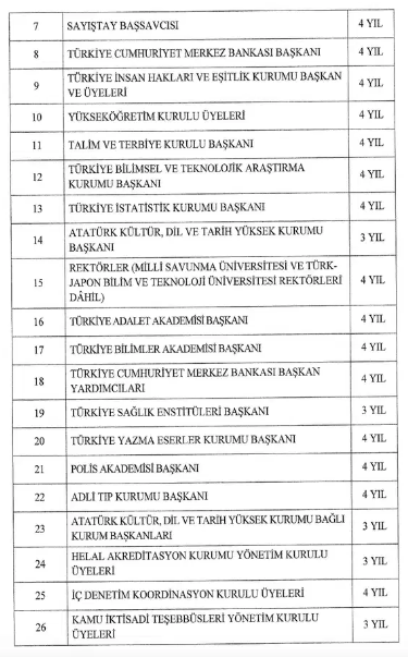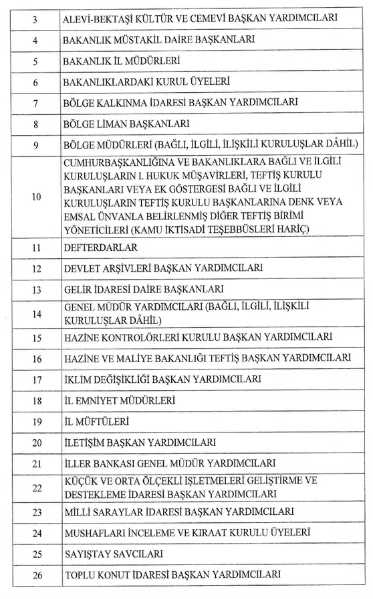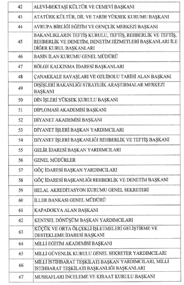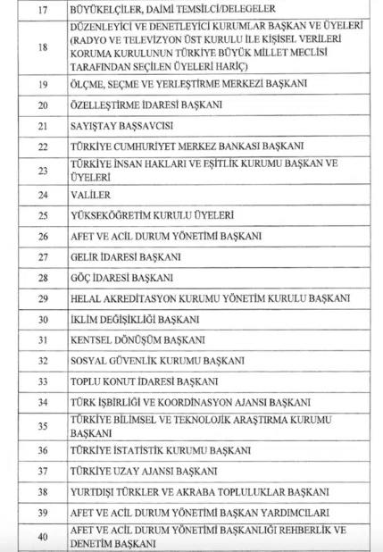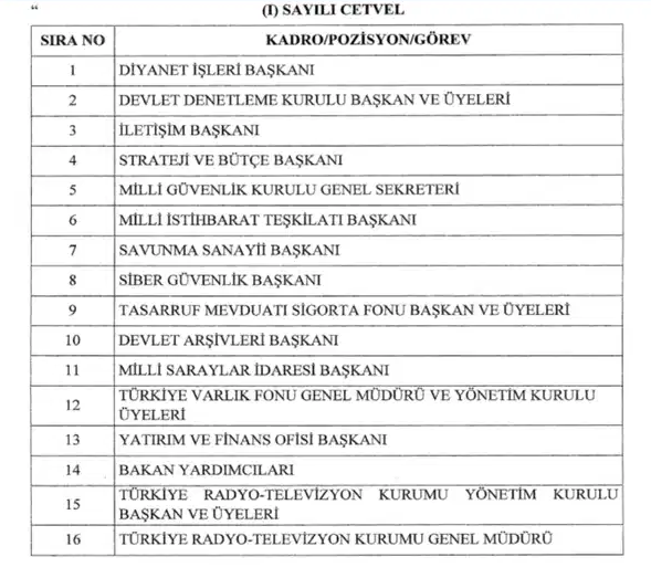 Düzenleme kapsamında Diyanet İşleri Başkanlığı, Milli İstihbarat Teşkilatı Başkanlığı, Milli Güvenlik Kurulu Genel Sekreterliği, İletişim Başkanlığı, Strateji ve Bütçe Başkanlığı, Savunma Sanayii Başkanlığı, Siber Güvenlik Başkanlığı, Türkiye Varlık Fonu yönetimi, TRT Yönetim Kurulu, Devlet Arşivleri Başkanlığı ve TMSF yönetimine kritik kurumların üst yönetimleri Cumhurbaşkanı kararıyla belirlenecek.