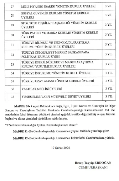 Üst düzey kamu kadrolarına yapılacak atamalara ilişkin düzenlemeleri de içeren Cumhurbaşkanlığı Kararnamesi, Resmi Gazete’de 19 Şubat 2026 tarihinde yayımlanarak yürürlüğe girdi.