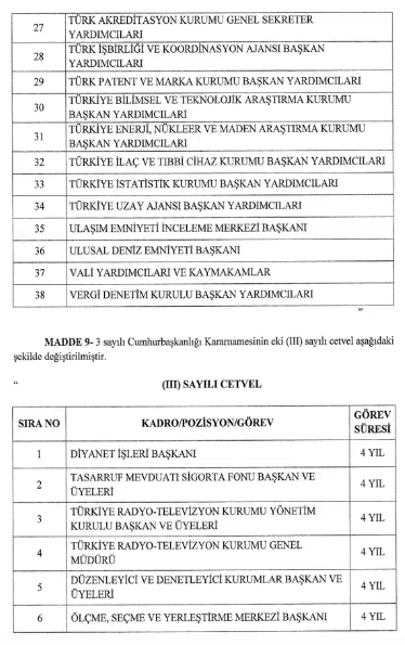 • Ekli (I) ve (II) sayılı cetvellerde yer alan kadro, pozisyon ve görevlere Cumhurbaşkanı kararıyla atama yapılacak.