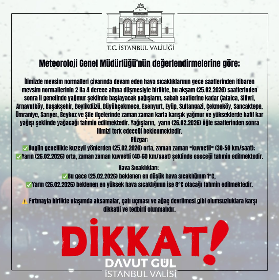 “İlimizde mevsim normalleri civarında devam eden hava sıcaklıklarının gece saatlerinden itibaren mevsim normallerinin 2 ila 4 derece altına düşmesiyle birlikte, bu akşam (25.02.2026) saatlerinden sonra il genelinde yağmur şeklinde başlayacak yağışların, sabah saatlerine kadar Çatalca, Silivri, Arnavutköy, Başakşehir, Beylikdüzü, Büyükçekmece, Esenyurt, Eyüp, Sultangazi, Çekmeköy, Sancaktepe, Ümraniye, Sarıyer, Beykoz ve Şile ilçelerinde zaman zaman karla karışık yağmur ve yükseklerde hafif kar yağışı şeklinde yağacağı tahmin edilmektedir. Yağışların, yarın (26.02.2026) öğle saatlerinden sonra ilimizi terk edeceği beklenmektedir. Bugün genellikle kuzeyli yönlerden (25.02.2026) orta, zaman zaman kuvvetli (30-50 km/saat);