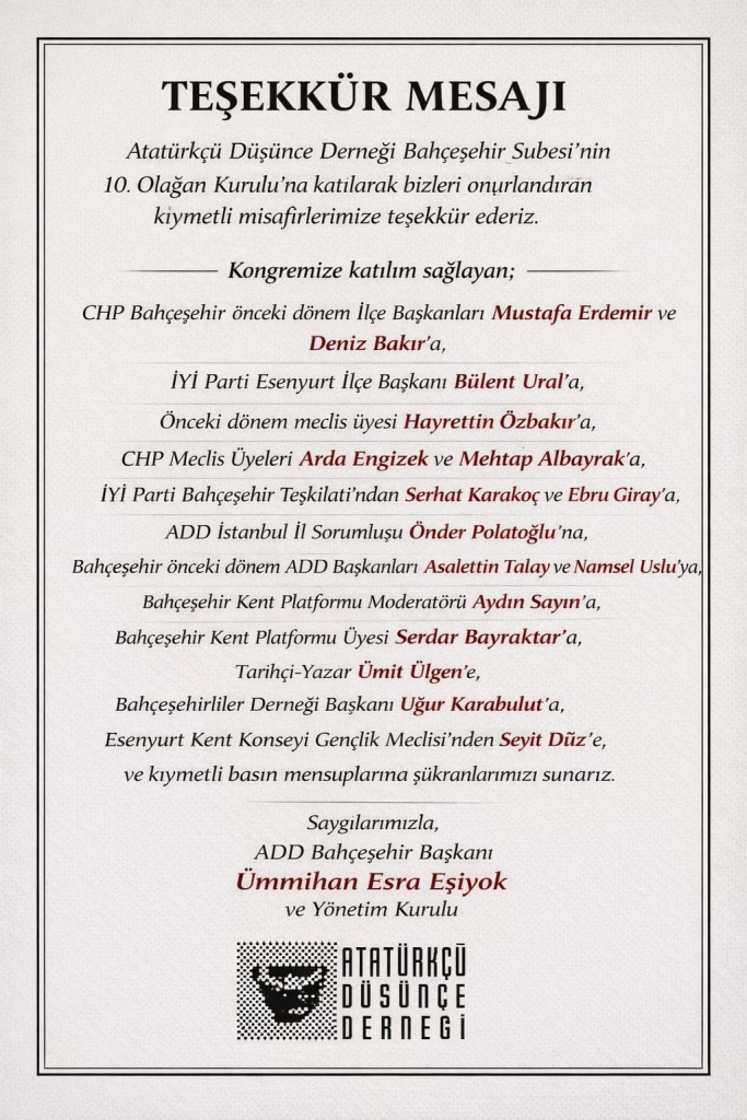 Atatürkçü Düşünce Derneği Bahçeşehir Şubesi’nin Olağan Kurulu’na katılarak bizleri onurlandıran tüm kıymetli misafirlerimize teşekkür ederiz.