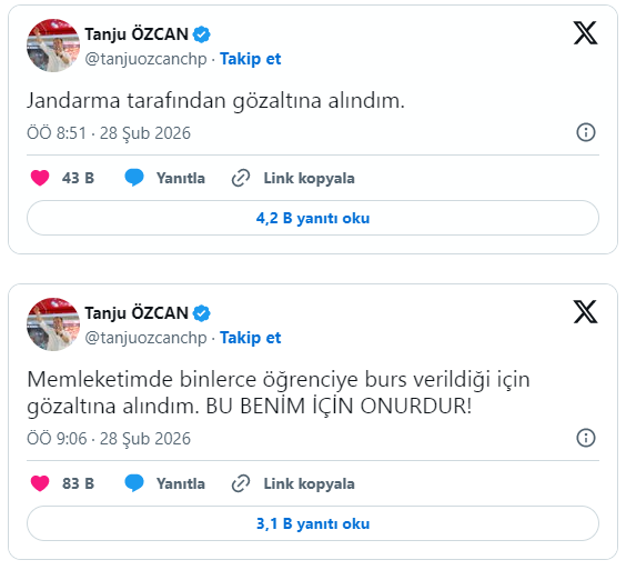 Gözaltı haberini ilk olarak sosyal medya platformu X üzerinden duyuran Özcan, “Jandarma tarafından gözaltına alındım” ifadelerini kullandı. Kısa süre sonra yaptığı ikinci paylaşımda ise, “Memleketimde binlerce öğrenciye burs verildiği için gözaltına alındım. Bu benim için onurdur” açıklamasında bulundu.