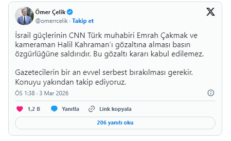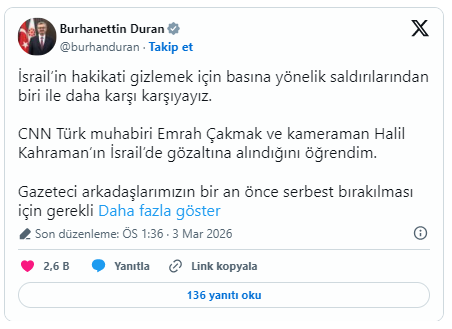 İletişim Başkanı Burhanettin Duran, X’ten yaptığı açıklamada, “CNN Türk muhabiri Emrah Çakmak ve kameraman Halil Kahraman’ın İsrail’de gözaltına alındığını öğrendim. Gazeteci arkadaşlarımızın bir an önce serbest bırakılması için gerekli girişimleri yapıyor ve konuyu hassasiyetle takip ediyoruz” dedi.