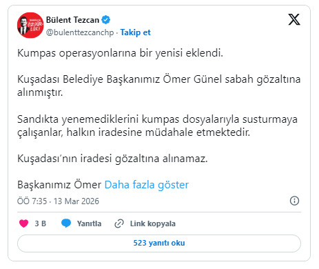 CHP Milletvekili Bülent Tezcan ise sosyal medya platformu X üzerinden operasyona tepki gösterdi. Tezcan paylaşımında, “Kumpas operasyonlarına bir yenisi eklendi. Kuşadası belediye başkanımız Ömer Günel sabah gözaltına alınmıştır.