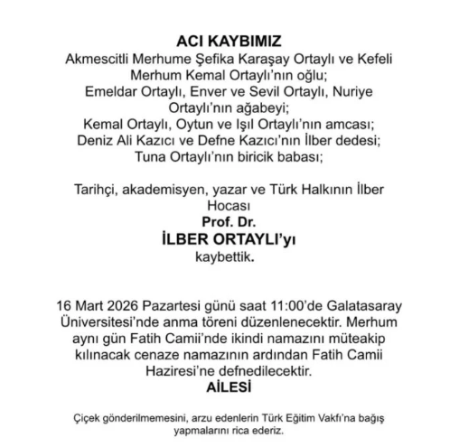 Ailesi, Ortaylı için 16 Mart 2026 Pazartesi günü saat 11.00’de Galatasaray Üniversitesi’nde anma töreni düzenleneceğini duyurdu.