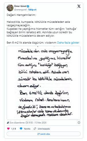 “Değerli hemşehrilerim; haksızlıkla, kumpasla, kötülükle mücadeleden asla vazgeçmeyeceğim. Kuşadası’na yaptığımız hizmetler tüm varlığını ‘koltuğa’ bağlayan birini rahatsız etti. Aslında uzun süredir bu kötülükle mücadelemiz devam ediyor.