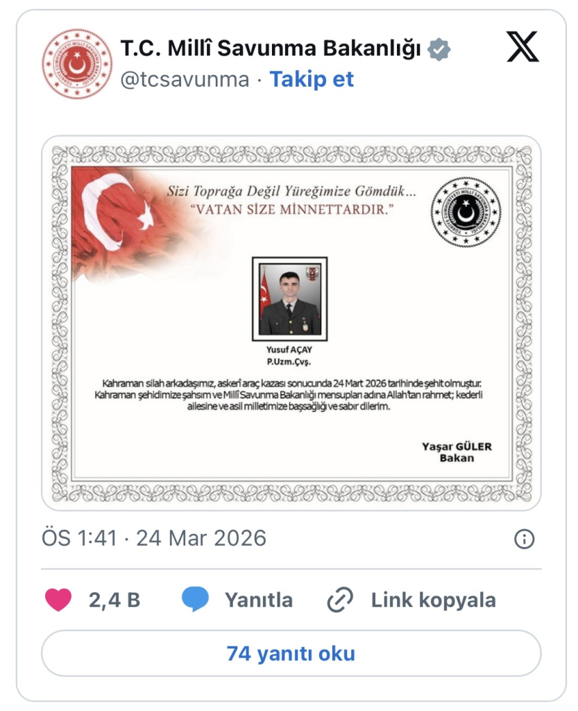 “Bugün Ağrı/Doğubayazıt’ta meydana gelen Şehit Piyade Uzman Çavuş Yusuf Açay’ın şehit olduğu askeri araç kazasında ağır yaralanmış olan kahraman silah arkadaşımız Ulaştırma Uzman Çavuş Selman Akarsel hastanede yapılan tüm müdahalelere rağmen kurtarılamayarak şehit olmuştur. Bizleri derin bir acı ve üzüntüye boğan bu olayda hayatını kaybeden aziz şehidimize Allah’tan rahmet, kederli ailesine, Türk Silahlı Kuvvetleri ile asil milletimize başsağlığı ve sabır dileriz.”