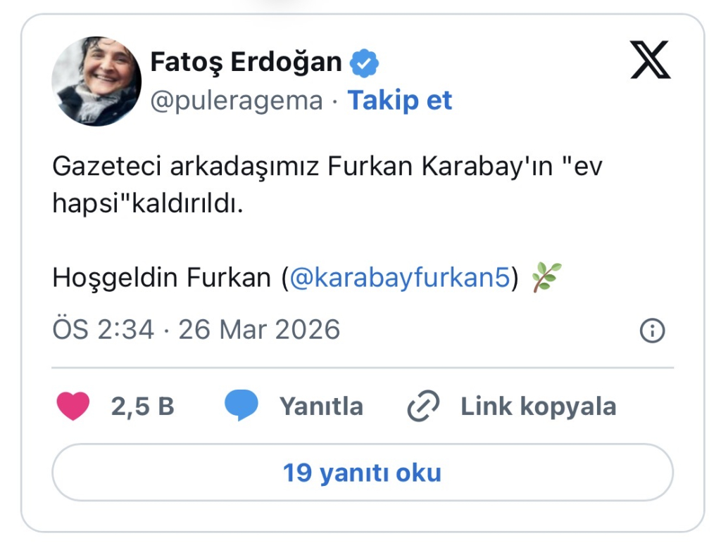 Karabay, “cumhurbaşkanına hakaret” ve “terörle mücadelede görev almış kişileri (savcılar) hedef göstermek” suçlamalarıyla 15 Mayıs’ta tutuklanmış, 201 gün tutuklu kaldığı Silivri Cezaevi’nde 2 Aralık 2025’te tahliye edilmişti.