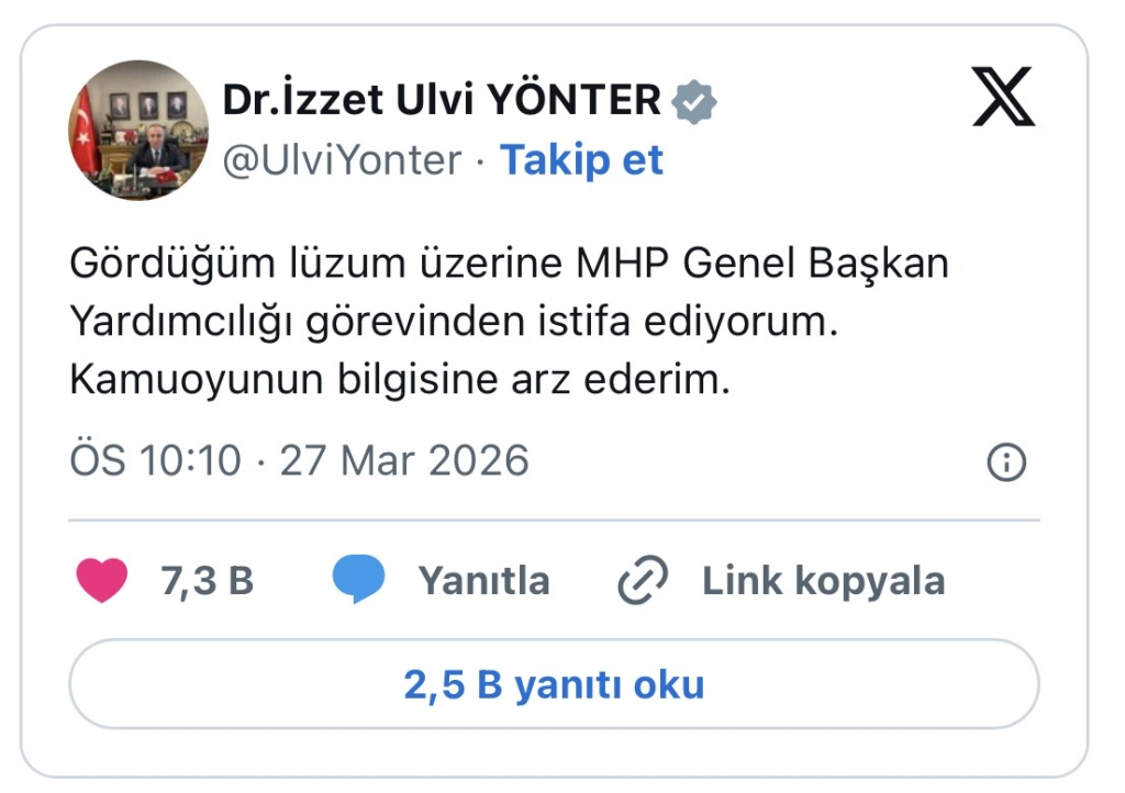 İzzet Ulvi Yönter, görevinden istifa ettiğini duyurdu. X üzerinden açıklama yapan Yönter, “Gördüğüm lüzum üzerine MHP Genel Başkan Yardımcılığı görevinden istifa ediyorum. Kamuoyunun bilgisine arz ederim.” ifadelerini kullandı.