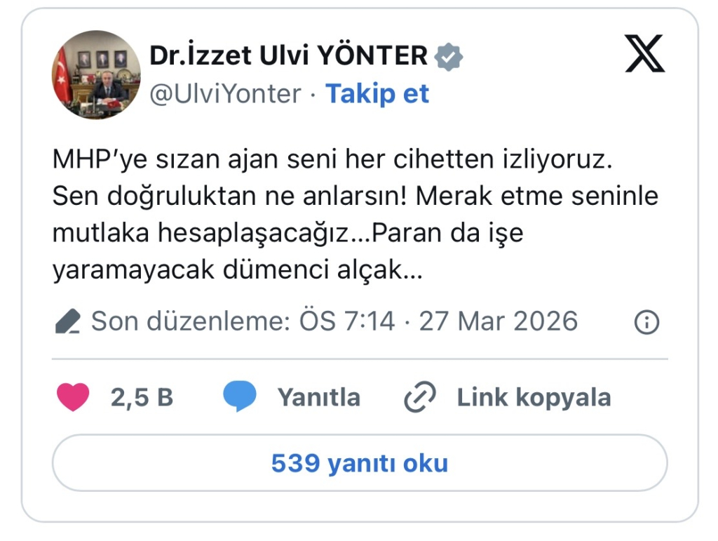 Yönter’in istifasından saatler önce yaptığı bir paylaşım da dikkat çekti. Söz konusu paylaşımda, “MHP’ye sızan ajan seni her cihetten izliyoruz. Sen doğruluktan ne anlarsın! Merak etme seninle mutlaka hesaplaşacağız… Paran da işe yaramayacak dümenci alçak…” ifadeleri yer aldı.